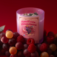 Realizzata con cera di soia 100% naturale, è profumata con una miscela avvolgente di uva,lampone, prugna, violetta e il legno di cedro che radicano la tua intenzione in una terra fertile di possibilità.