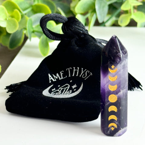 Questa punta di cristallo incisa con il simbolo dorato delle fasi della luna è pensata per accompagnarti ovunque: sul tuo altare portatile, sulla scrivania, nella tua borsa o nello spazio in cui desideri creare energia positiva.