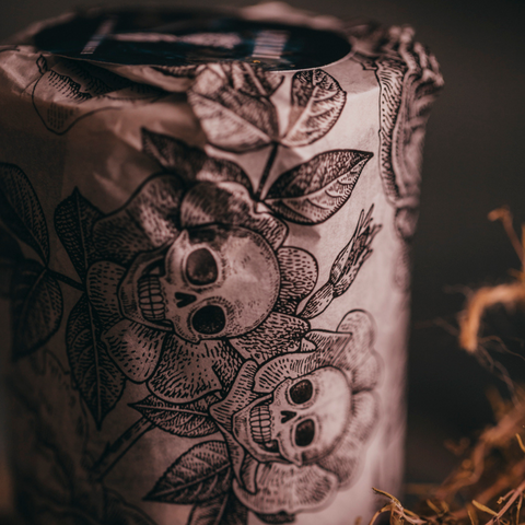 Ogni candela arriva all'interno di una scatola in cartoncino ad effetto "esplosione" che si apre espandendosi, la candela è avvolta dalla sua carta regalo in tema gotico, accompagnato da un flyer di presentazione in carta premium.