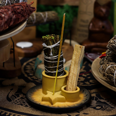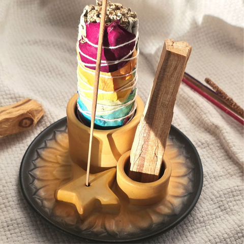 Realizzato nei toni caldi della sabbia e del grigio pietra, questo strumento unisce estetica meditativa e funzionalità, creando un piccolo altare in cui far fluire il fumo sacro con armonia e intenzione.